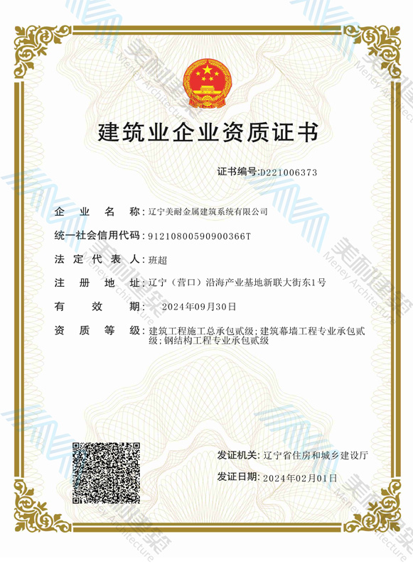 遼寧美耐金屬建筑系統(tǒng)有限公司位于遼寧(營(yíng)口)沿海產(chǎn)業(yè)基地,專(zhuān)注于預(yù)制金屬建筑系統(tǒng)領(lǐng)域,是一家集工業(yè)建筑設(shè)計(jì)、制作、施工及相關(guān)的技術(shù)咨詢(xún)與服務(wù)為一體的綜合性服務(wù)企業(yè)。作為國(guó)家鋼結(jié)構(gòu)協(xié)會(huì)會(huì)員、中國(guó)建筑金屬結(jié)構(gòu)協(xié)會(huì)會(huì)員單位與國(guó)家高新技術(shù)企業(yè),美耐建筑集建筑工程施工總承包、鋼結(jié)構(gòu)工程專(zhuān)業(yè)承包等多種資質(zhì)于一身,并擁有22項(xiàng)鋼結(jié)構(gòu)建筑領(lǐng)域?qū)@?項(xiàng)軟件著作權(quán)。